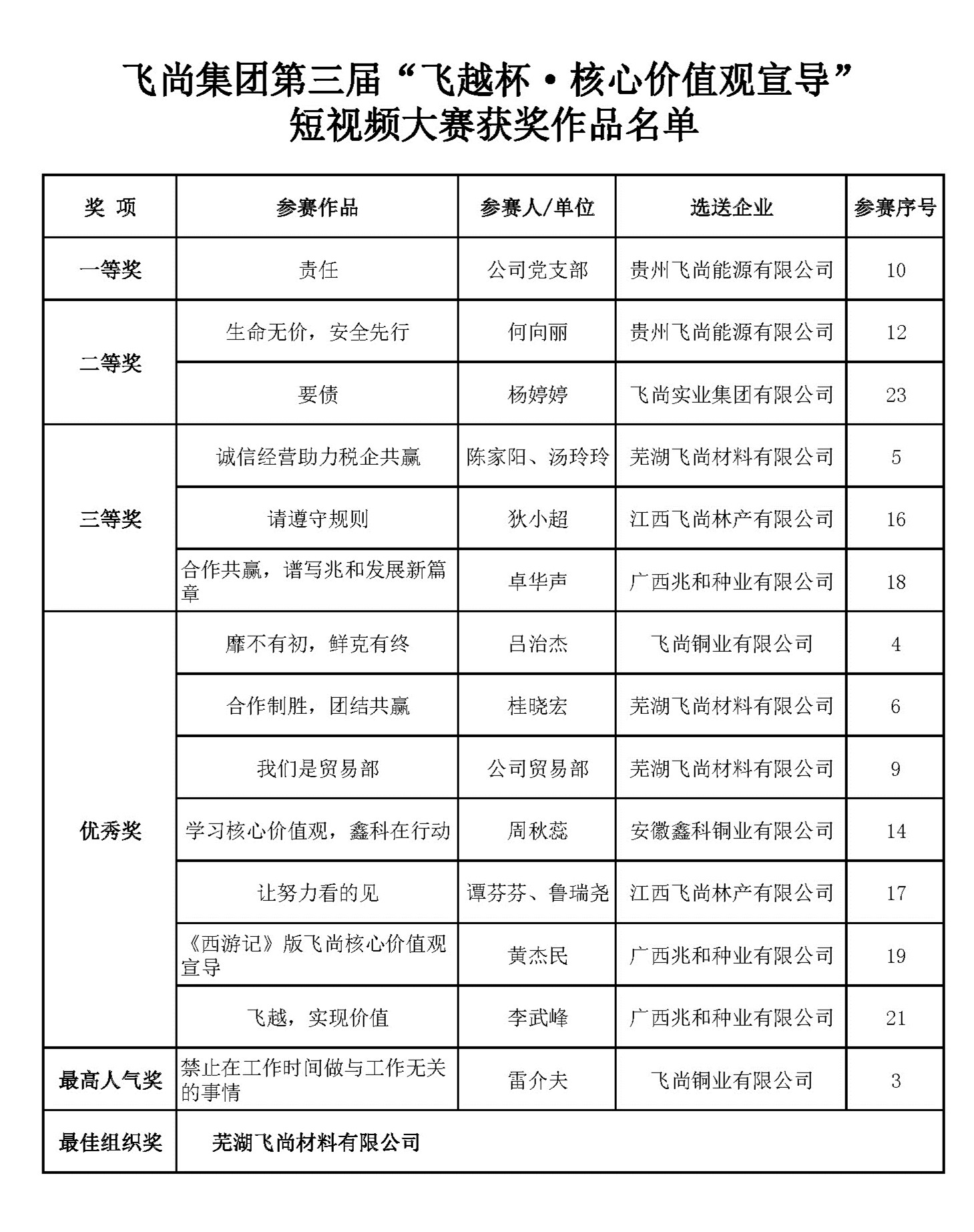 第三届“飞越杯·核心价值观宣导”短视频大赛获奖名(míng)单