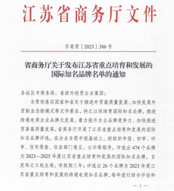 盐城捷康入选江苏省商(shāng)務(wù)厅重点培育发展的國(guó)际知名(míng)品牌