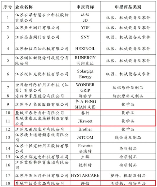 近日,江苏省商(shāng)務(wù)厅发布2023—2025年度江苏省重点培育和发展的國(guó)际知名(míng)品牌名(míng)单,在盐城市获牌的18家企业中(zhōng),射阳县仅3家,其中(zhōng)盐城捷康三氯蔗糖制造有(yǒu)限公(gōng)司作(zuò)為(wèi)射阳标杆企业上榜。